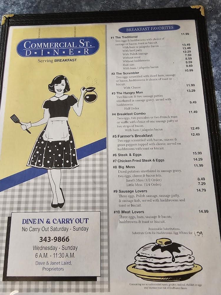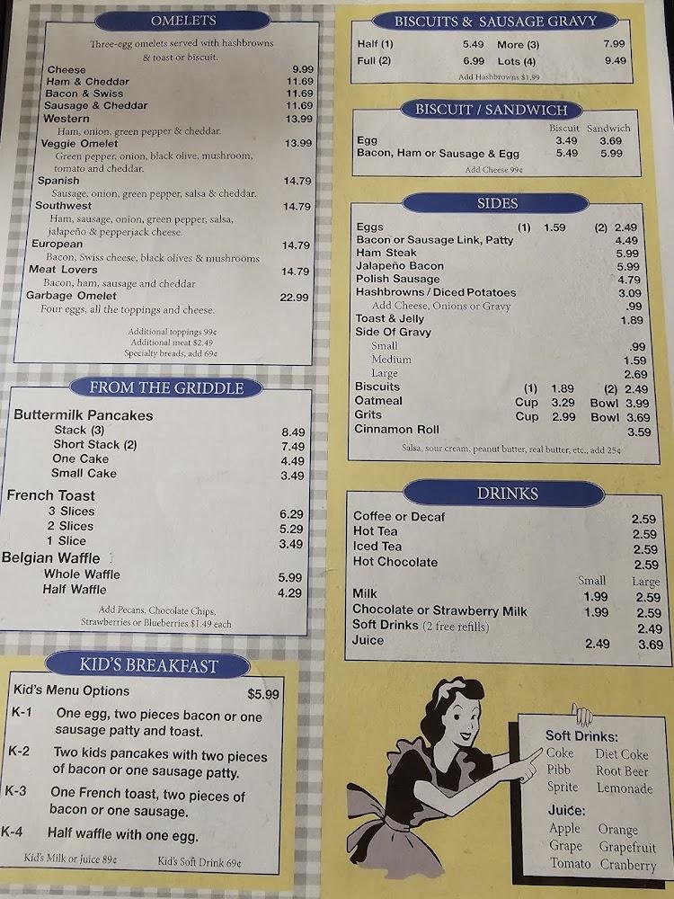 The menu is diverse, showcasing American diner classics. Breakfast options feature eggs, bacon, and fluffy pancakes. The biscuits and gravy pair wonderfully with many dishes.